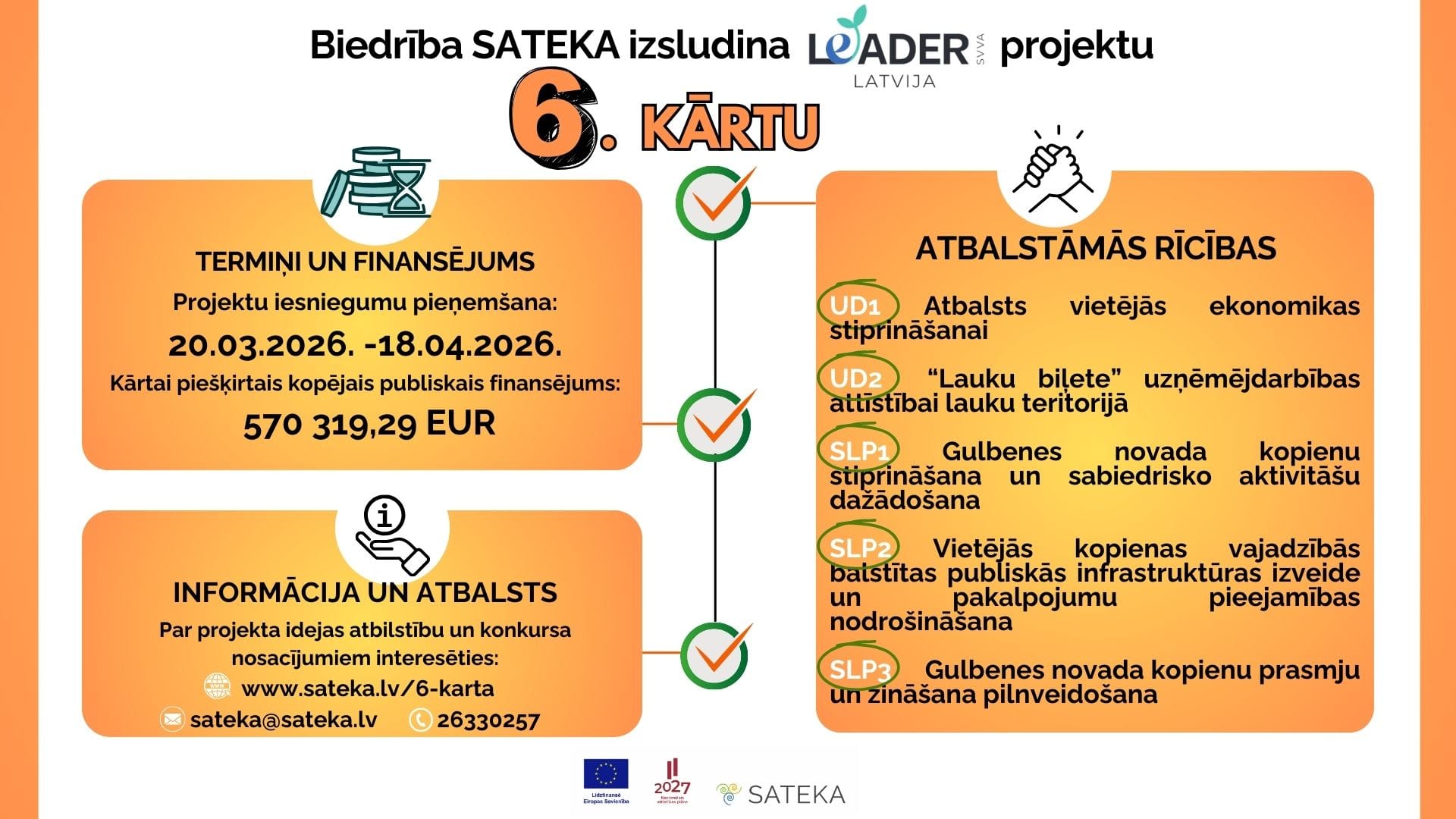 Biedrība “SATEKA” izsludina atklātu projektu iesniegumu pieņemšanas 6.kārtu Eiropas Savienības Eiropas Lauksaimniecības fonda lauku attīstībai Kopējās lauksaimniecības politikas stratēģiskā plāna 2023.-2027.gadam intervences LA19 “Darbību īstenošana saskaņā ar sabiedrības virzītas vietējās attīstības stratēģiju, tostarp sadarbības aktivitātes un to sagatavošana” aktivitātēs “Vietējās ekonomikas stiprināšanas iniciatīvas” un “Kopienu spēcinošas un vietas attīstību sekmējošas iniciatīvas”.